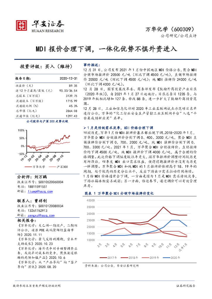 华安证券:万华化学(600309)-MDI报价合理下调,一体化优势不惧外资进入.pdf