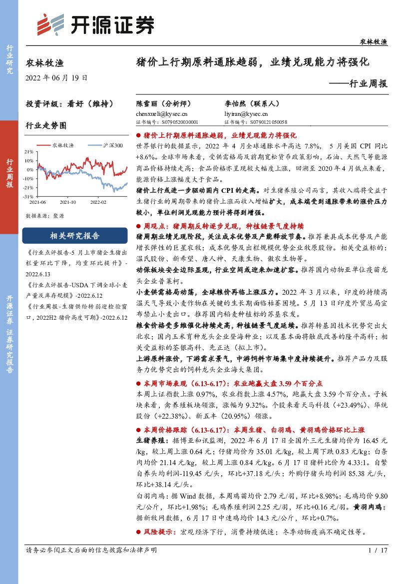 开源证券:农林牧渔行业周报:猪价上行期原料通胀趋弱,业绩兑现能力将强化.pdf