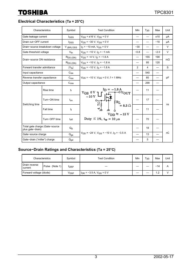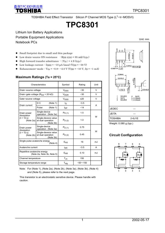 TOSHIBA Field Effect Transistor Silicon P Channel MOS Type (L 2 −π−MOSVI) TPC8301 数据手册.pdf