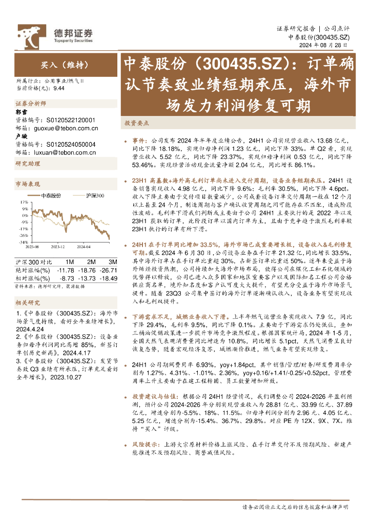 德邦证券:中泰股份(300435)-订单确认节奏致业绩短期承压,海外市场发力利润修复可期.pdf