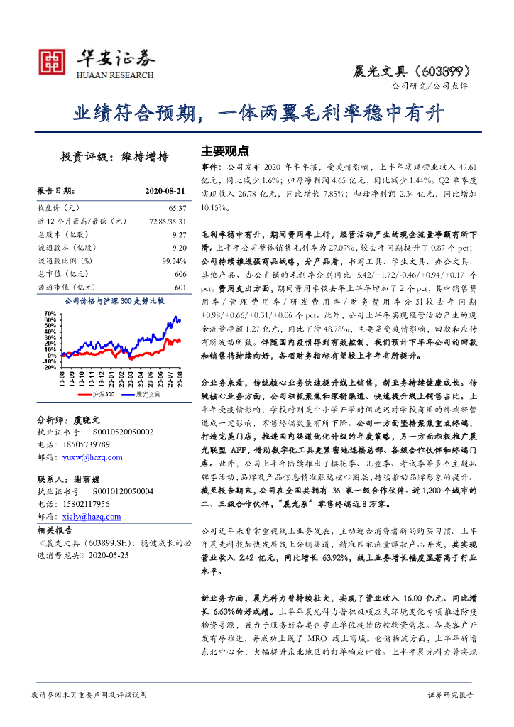 华安证券:晨光文具(603899)-业绩符合预期,一体两翼毛利率稳中有升.pdf