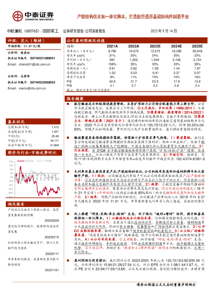中泰证券:中航重机(600765)-产能结构优化和一体化降本,打造航空通用基础结构件制造平台.pdf