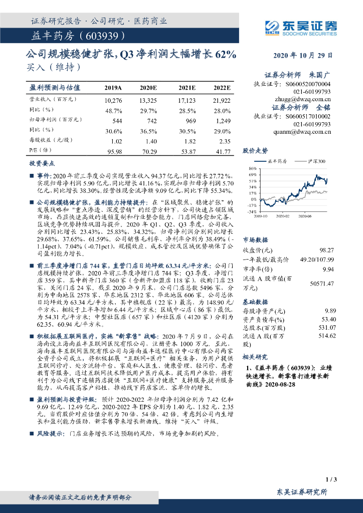 东吴证券:益丰药房(603939)-公司规模稳健扩张,Q3净利润大幅增长62%.pdf