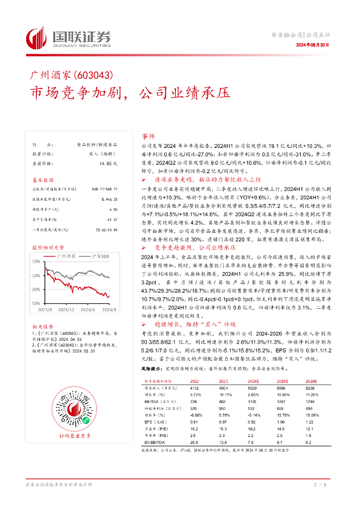 国联证券:广州酒家(603043)-市场竞争加剧,公司业绩承压.pdf