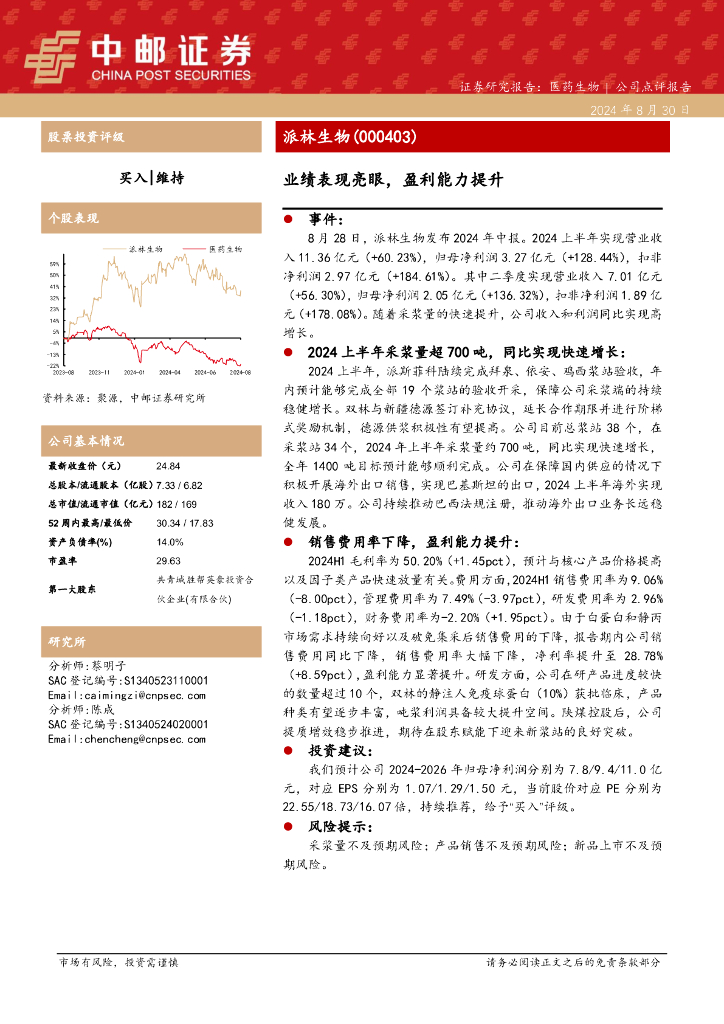 中邮证券:派林生物(000403)-业绩表现亮眼,盈利能力提升.pdf
