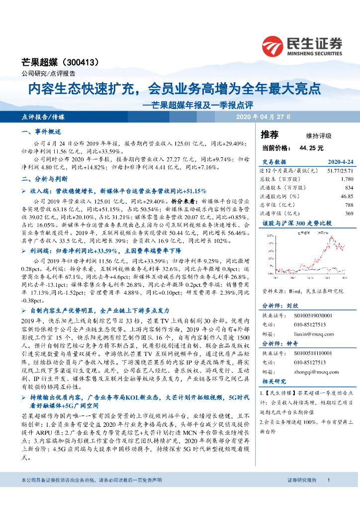 民生证券:芒果超媒年报及一季报点评:内容生态快速扩充,会员业务高增为全年最大亮点.pdf
