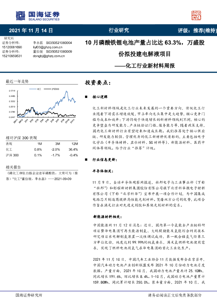 国海证券:化工行业新材料周报:10月磷酸铁锂电池产量占比达63.3%,万盛股份拟投建电解液项目.pdf