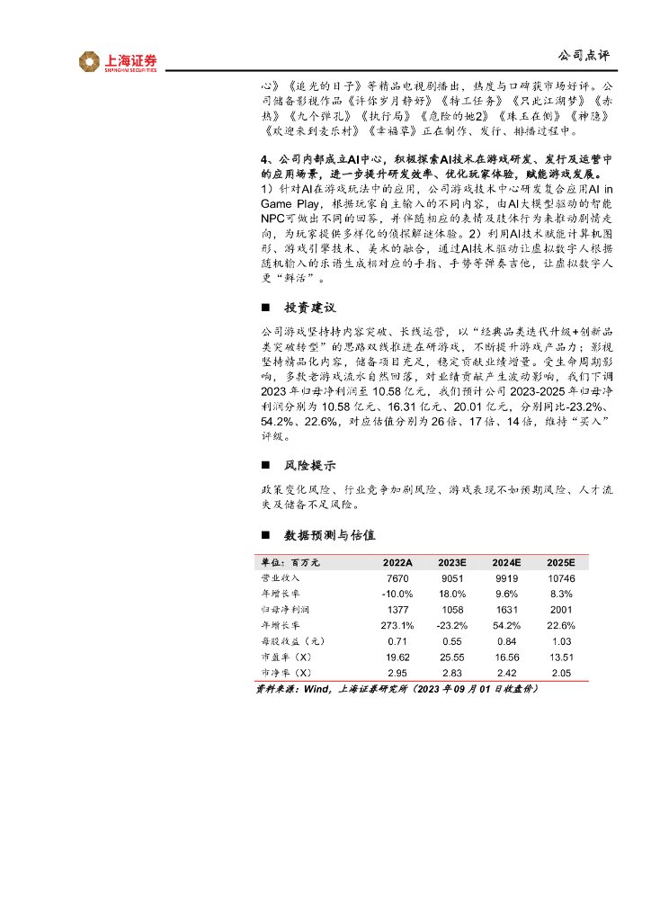 上海证券:完美世界2023年半年报点评:业绩符合预期,新游戏业绩逐步释放.pdf