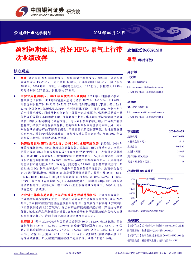 中国银河:永和股份(605020)-盈利短期承压,看好HFCs景气上行带动业绩改善.pdf