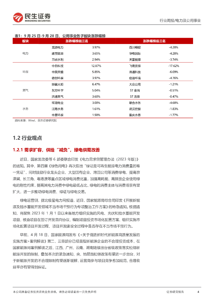 民生证券:公用事业行业周报(2023年第39周):绿电获扩需减负“双击”,水处理市场“方兴未艾”.pdf