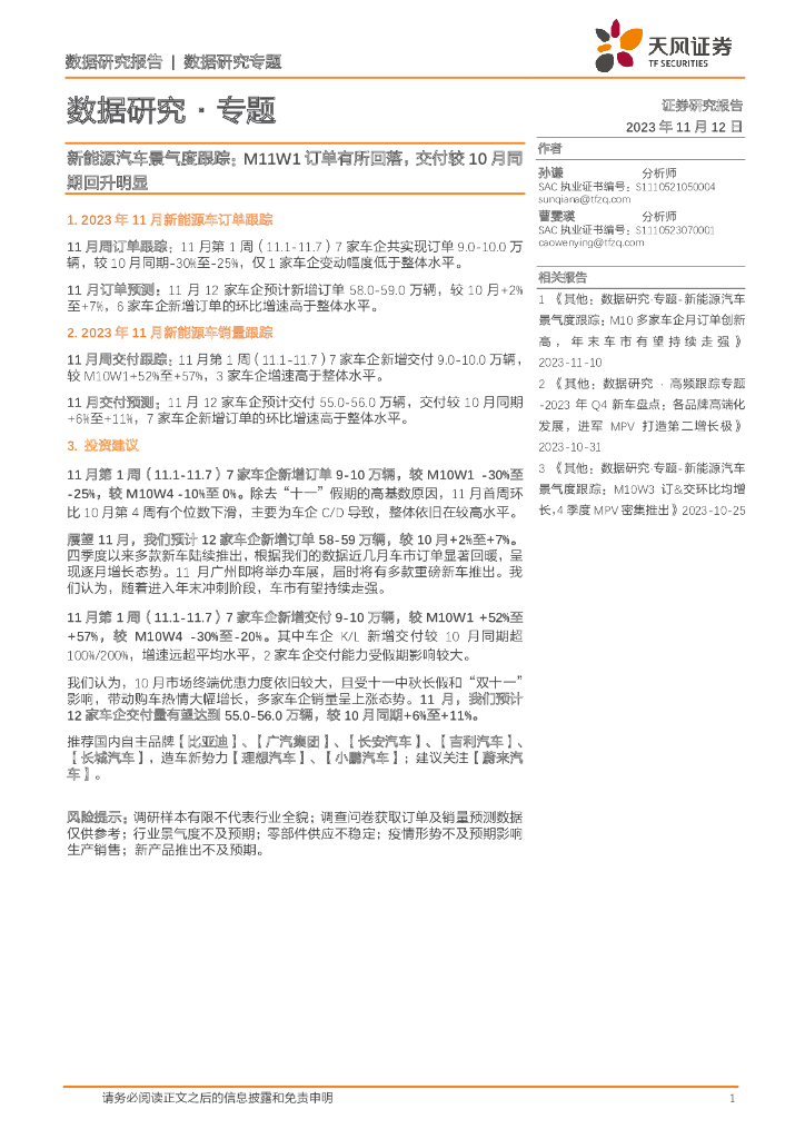 天风证券:新能源汽车景气度跟踪:M11W1订单有所回落,交付较10月同期回升明显.pdf