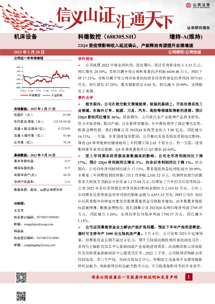 山西证券:科德数控(688305)-22Q4受疫情影响收入延迟确认,产能释放有望提升业绩增速.pdf