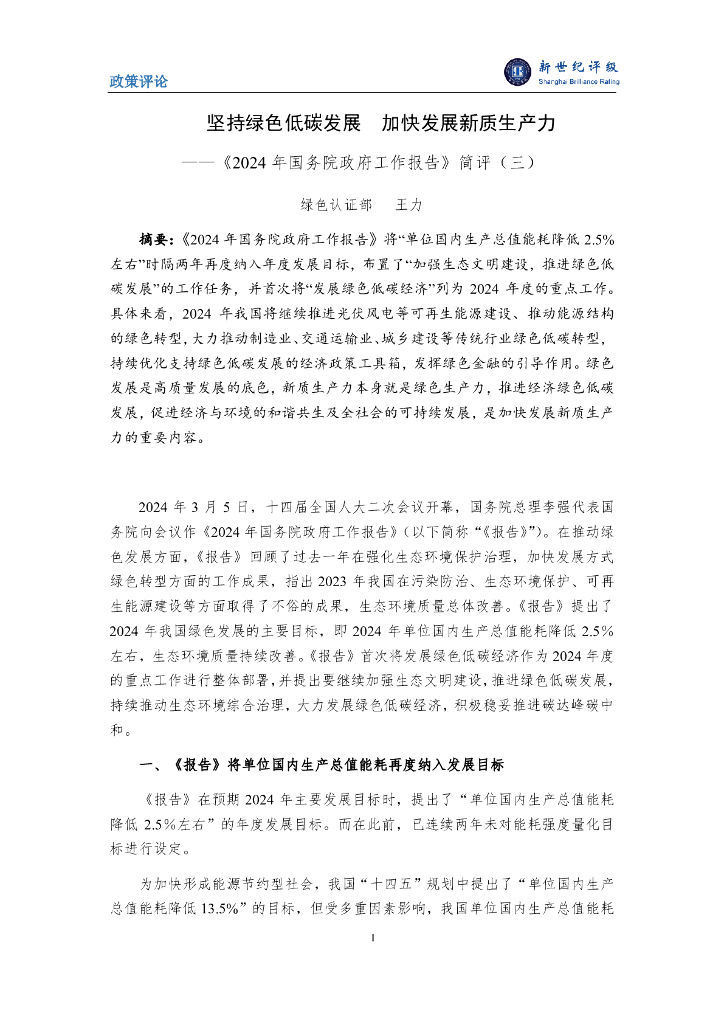 新世纪评级:坚持绿色低碳发展 加快发展新质生产力——《2024年国务院政府工作报告》简评(三).pdf