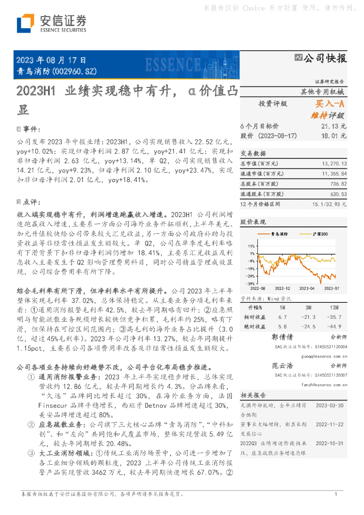 安信证券:青鸟消防(002960)-2023H1业绩实现稳中有升,α价值凸显.pdf