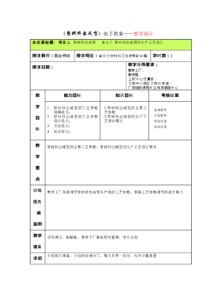 《塑料挤出成型》电子教案-项目2 管材挤出成型 单元7 管材挤出成型的生产工艺设计.pdf