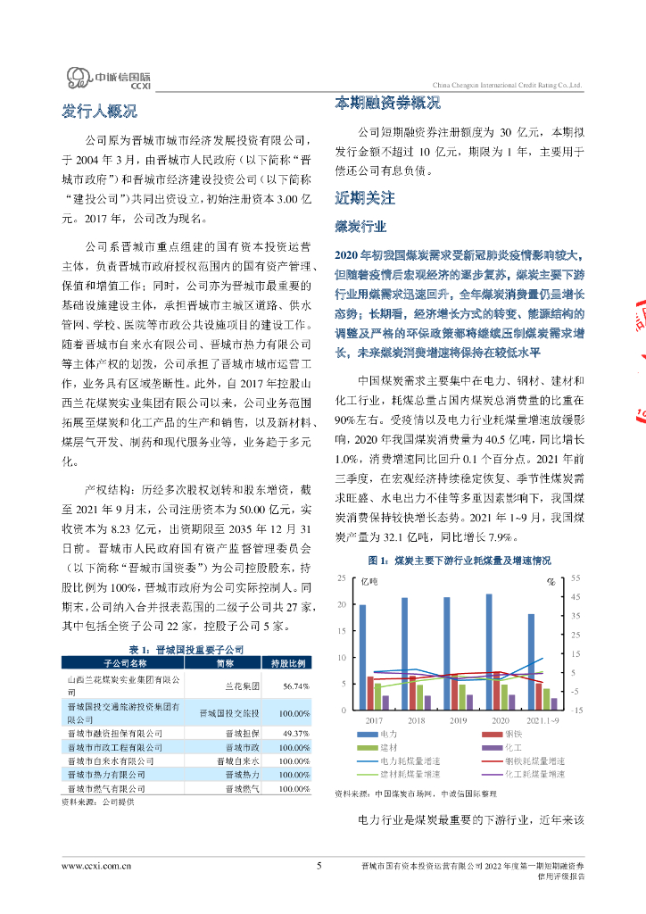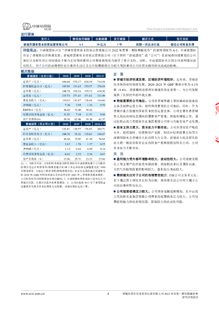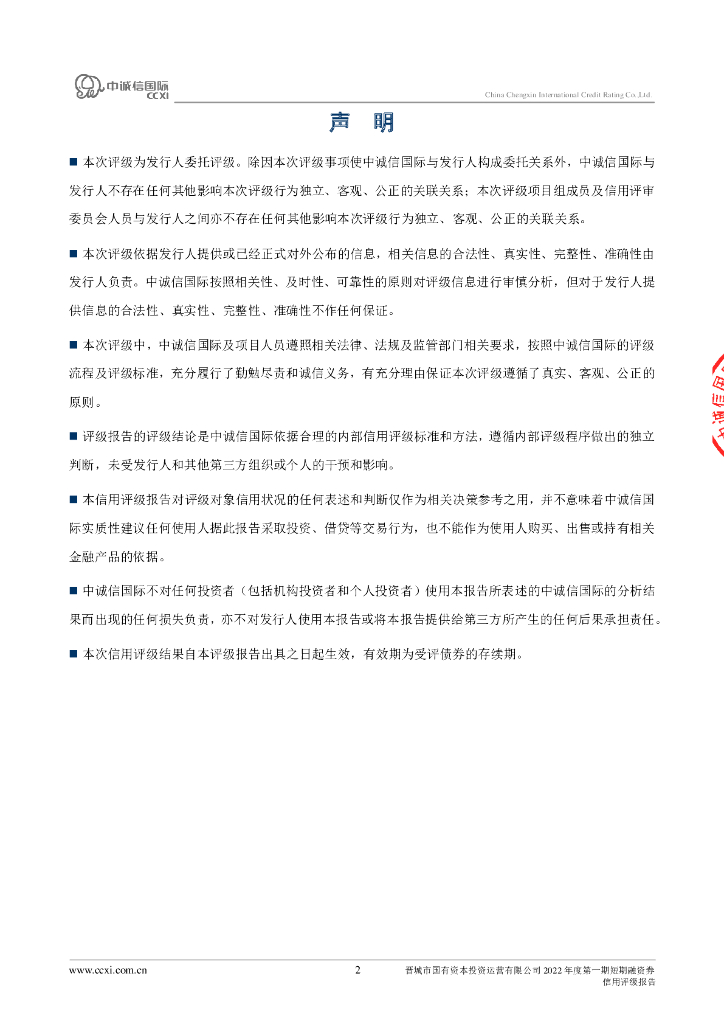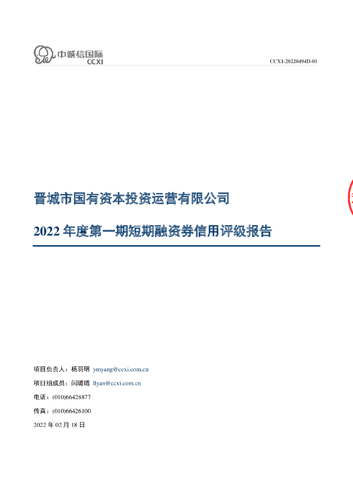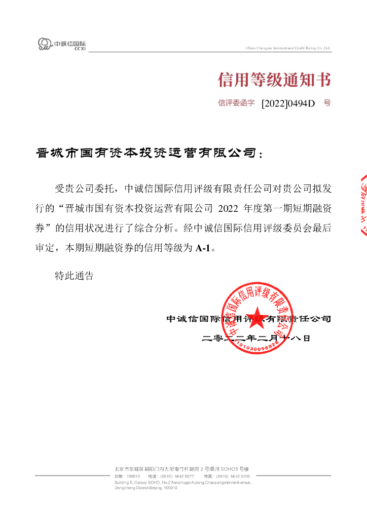 中诚信:晋城市国有资本投资运营有限公司2022年第一期短期融资券信用评级报告.pdf