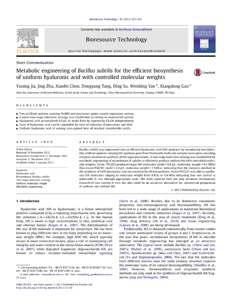 《药学的生物化学基础》文献资料-Metabolic engineering of Bacillus subtilis for the efficient biosynthesis of uniform hyaluro.pdf