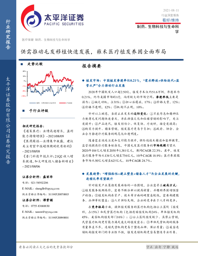 太平洋证券:制药、生物科技与生命科学——供需推动毛发移植快速发展,雍禾医疗植发养固全面布局.pdf