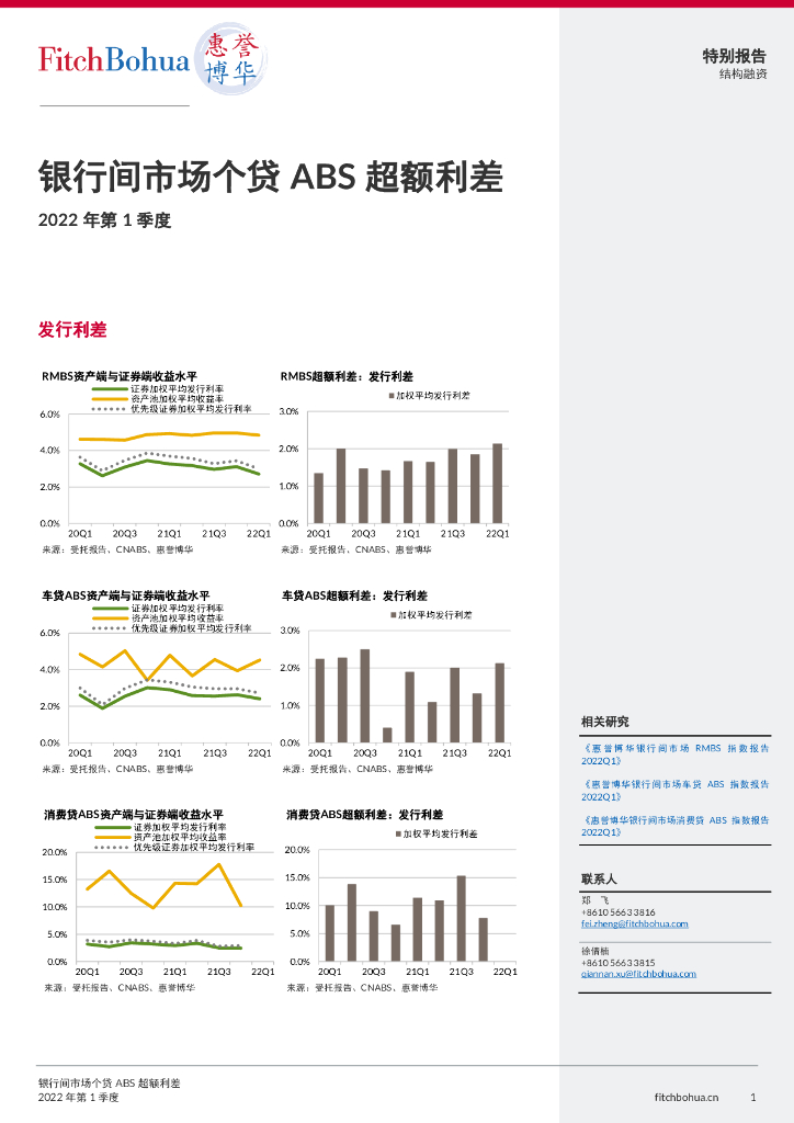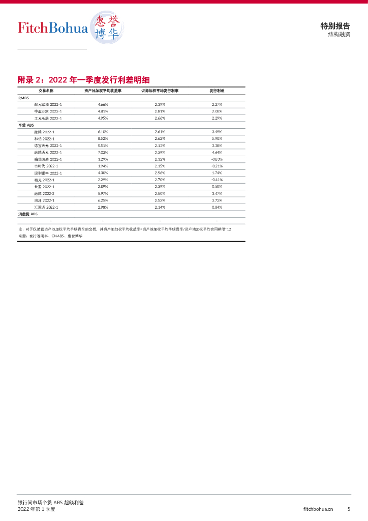 RMBS:2022年第一季度内发行的RMBS资产池加权平均收益率为4.84%,略低于上季度水平;证券加权平均发行利率为2.71%,较上季度下降41bp,导致利差">