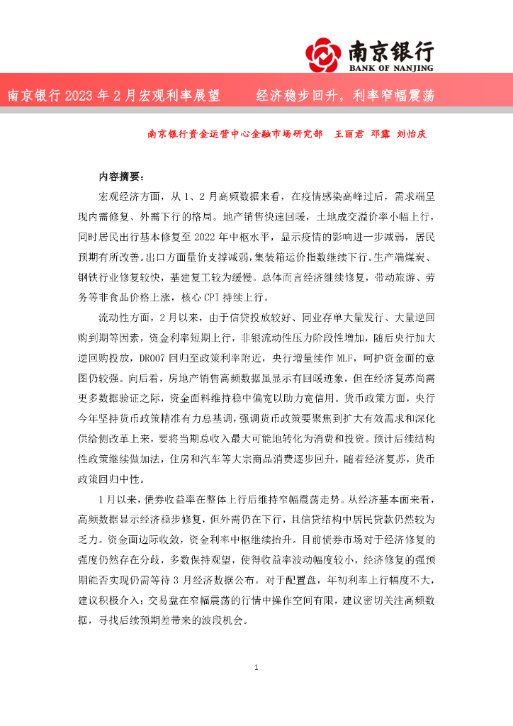 南京银行:经济稳步回升,利率窄幅震荡-2023年2月宏观利率展望.pdf