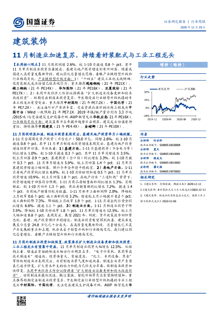 国盛证券:建筑装饰行业周报:11月制造业加速复苏,持续看好装配式与工业工程龙头.pdf