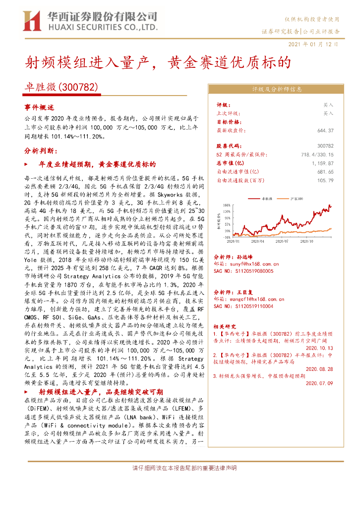 华西证券:卓胜微(300782)-射频模组进入量产,黄金赛道优质标的.pdf