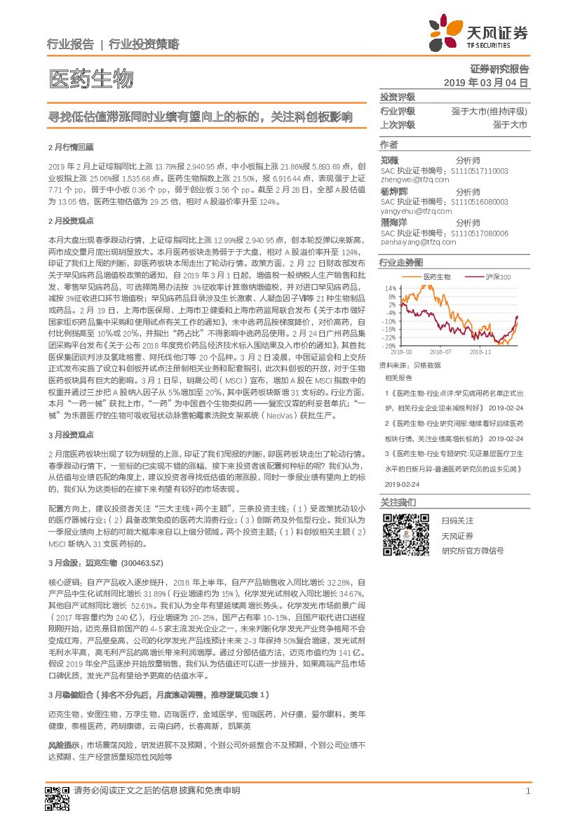 天风证券:医药生物行业投资策略:寻找低估值滞涨同时业绩有望向上的标的,关注科创板影响.pdf
