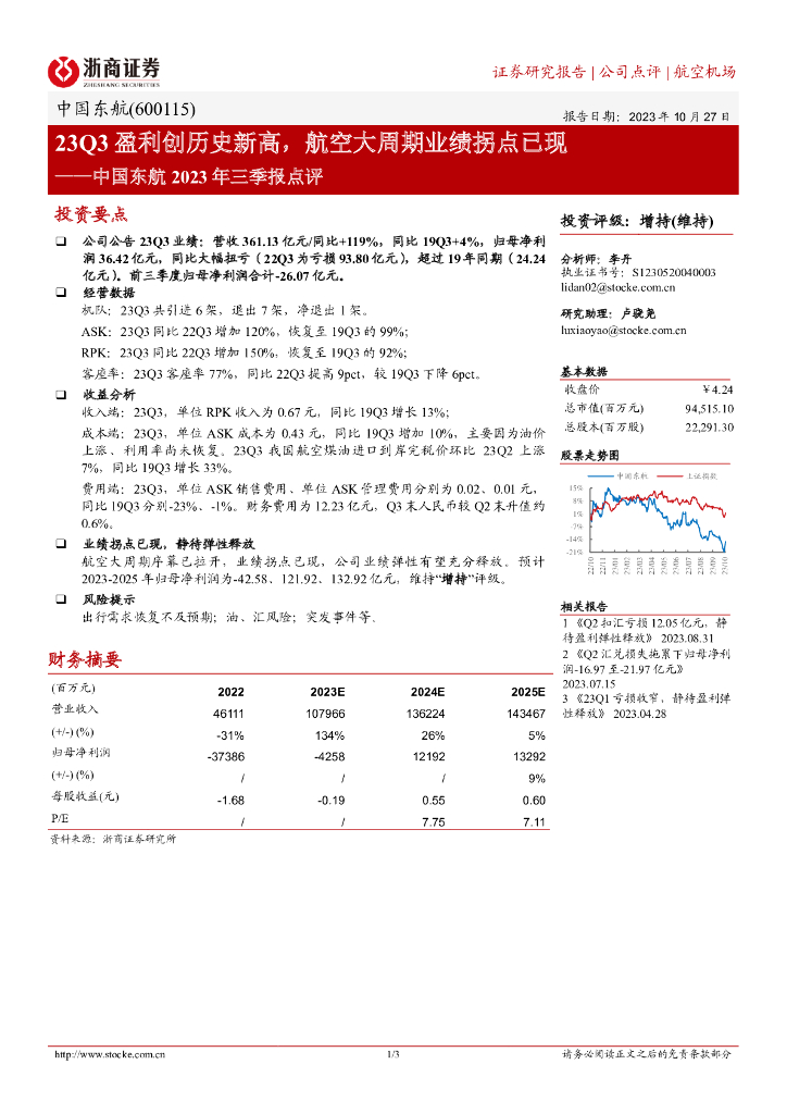 浙商证券:中国东航(600115)-23Q3盈利创历史新高,航空大周期业绩拐点已现.pdf