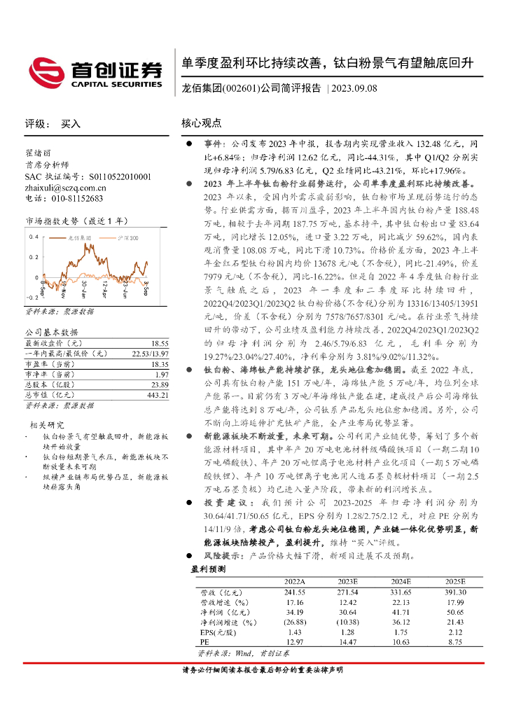 首创证券:龙佰集团(002601)-公司简评报告:单季度盈利环比持续改善,钛白粉景气有望触底回升.pdf