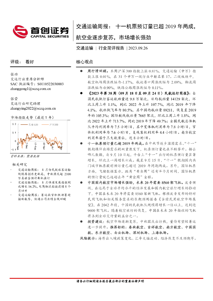 首创证券:交通运输周报:十一机票预订量已超2019年两成,航空业逐步复苏,市场增长强劲.pdf