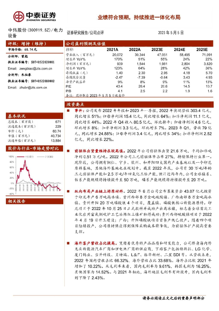 中泰证券:中伟股份(300919)-业绩符合预期,持续推进一体化布局.pdf