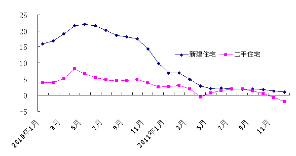 全市新建住宅销售价格同比涨幅延续了上年6月份以来的回落态势,由1月份上涨6.8%,逐步回落到12月份上涨1%;从环比看,12月份下降0.1%,连续两个月环比下降。其中,新建商品住宅销售价格由1月份同比上涨9.1%回落到12月份上涨1.3%;从环比看,12月份下降0.2%,连续三个月环比下降。二手住宅价格由1月份同比上涨2.6%转为12月份下降2%;从环比看,12月份下降0.8%,连续四个月环比下降。