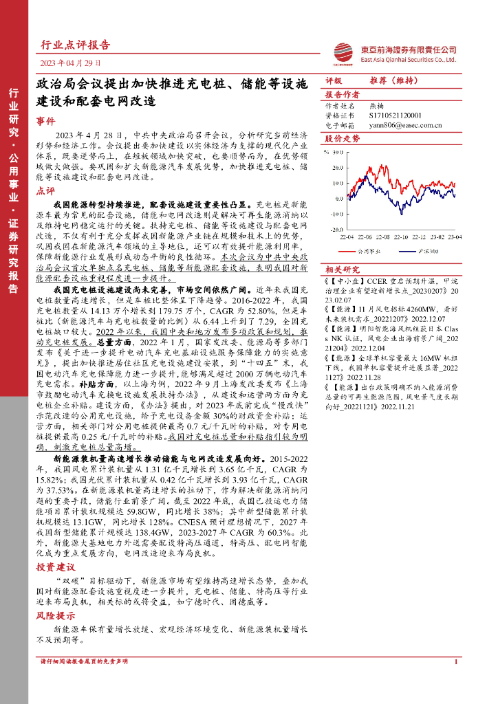 东亚前海证券:公用事业行业点评报告:政治局会议提出加快推进充电桩、储能等设施建设和配套电网改造.pdf