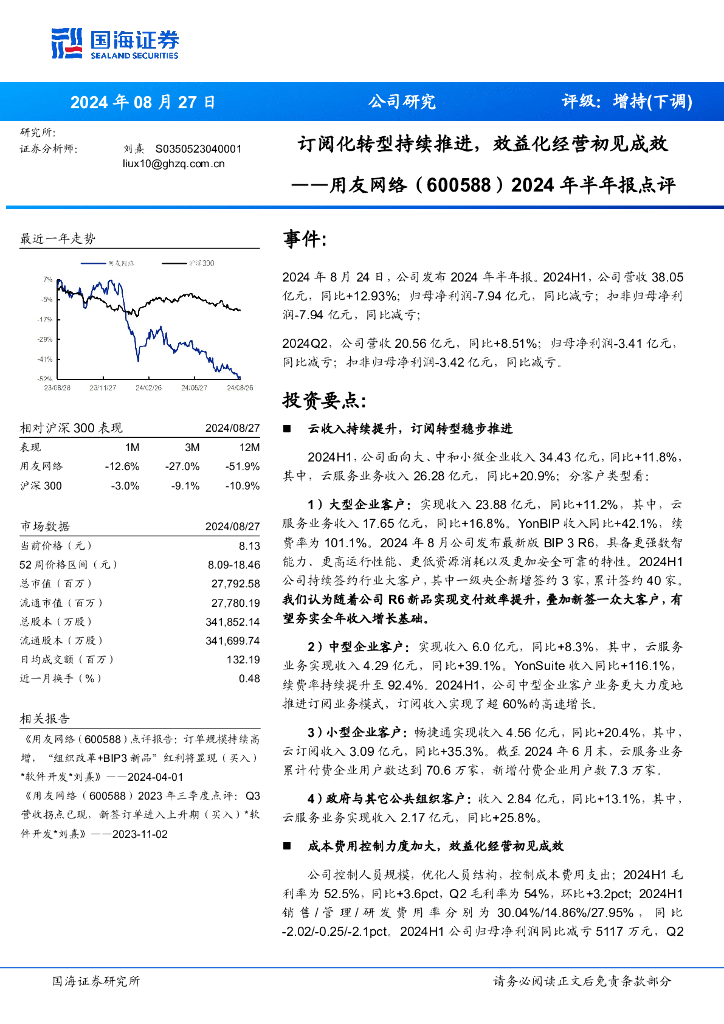 国海证券:用友网络(600588)-2024年半年报点评:订阅化转型持续推进,效益化经营初见成效.pdf