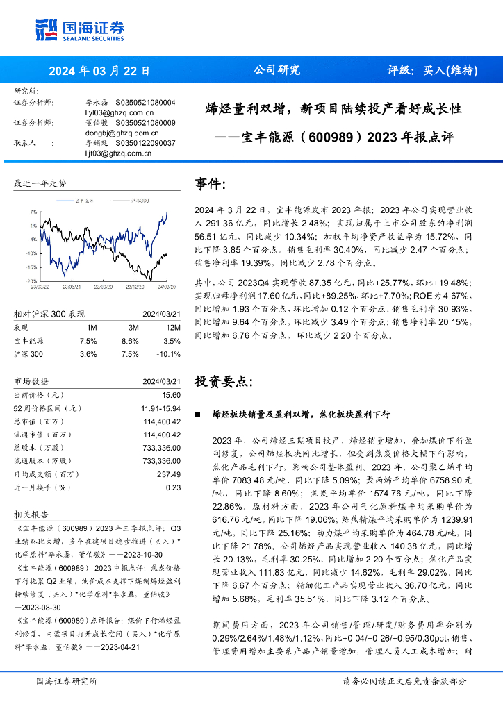 国海证券:宝丰能源(600989)-烯烃量利双增,新项目陆续投产看好成长性年报点评2023.pdf