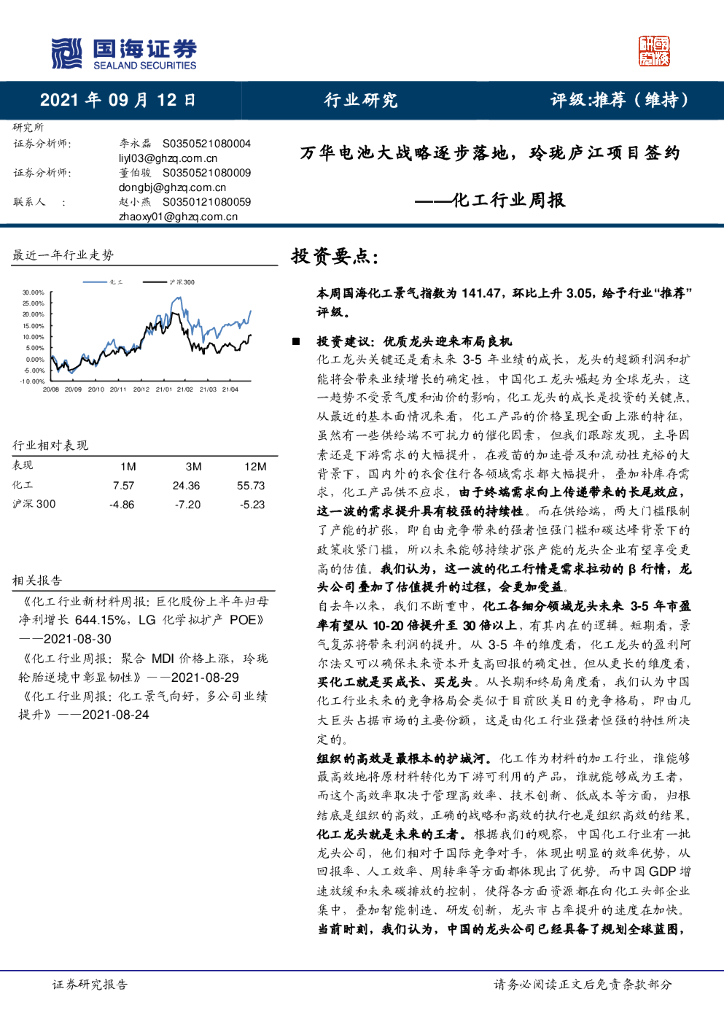国海证券:化工行业周报:万华电池大战略逐步落地,玲珑庐江项目签约.pdf