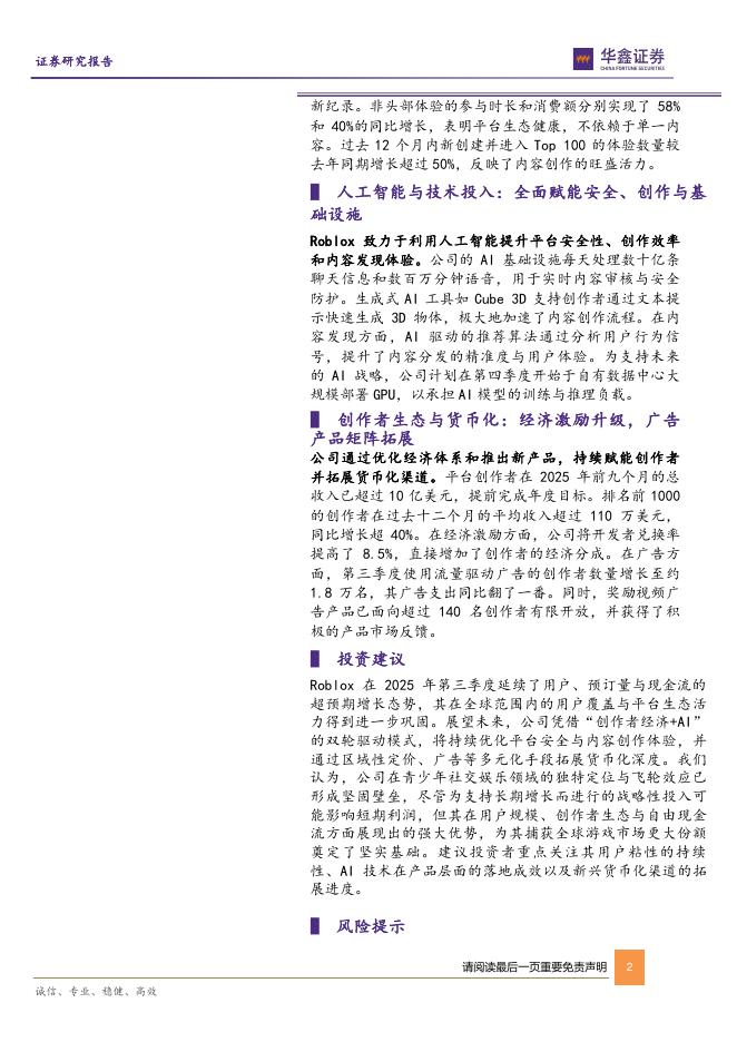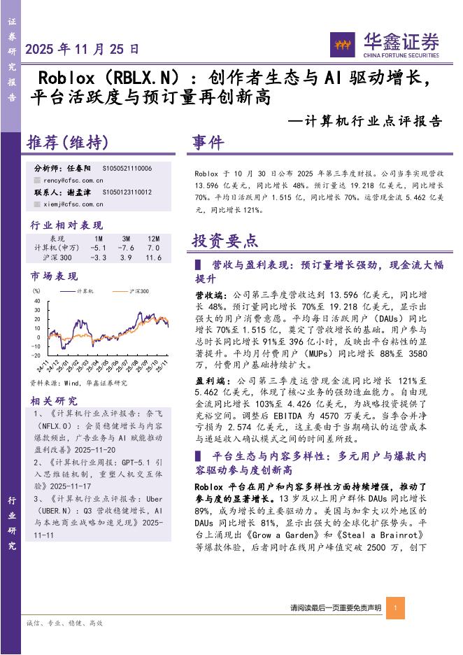 华鑫证券:计算机行业点评报告:Roblox:创作者生态与AI驱动增长,平台活跃度与预订量再创新高.pdf