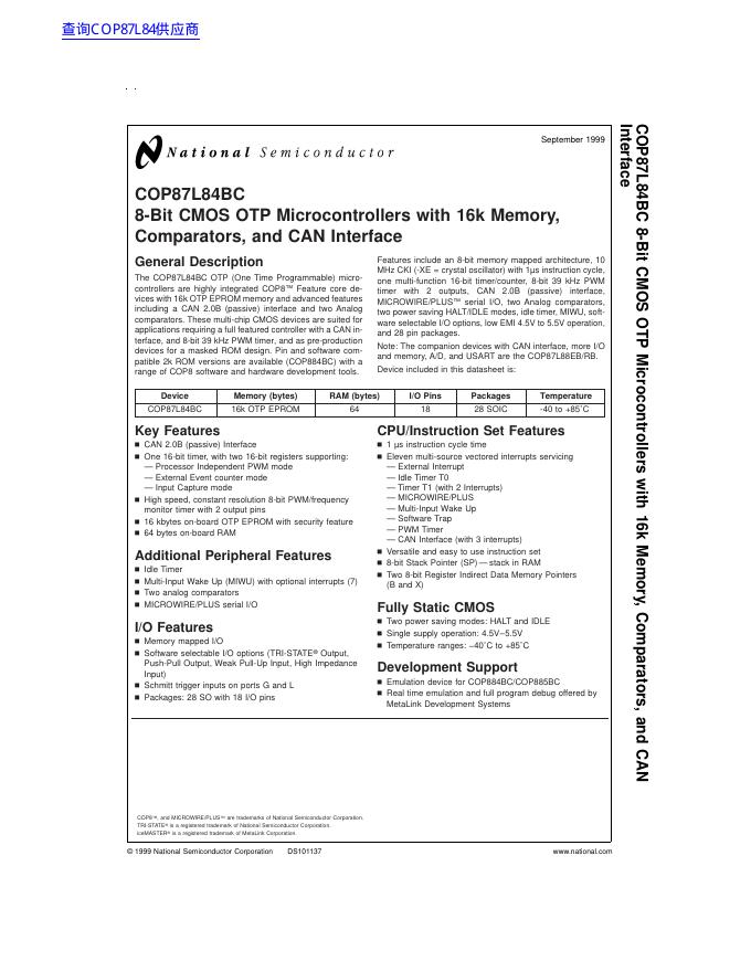 National semiconductor COP87L84BC 8-Bit CMOS OTP Microcontrollers with 16k Memory, Comparators, and CAN Interface 数据手册.pdf
