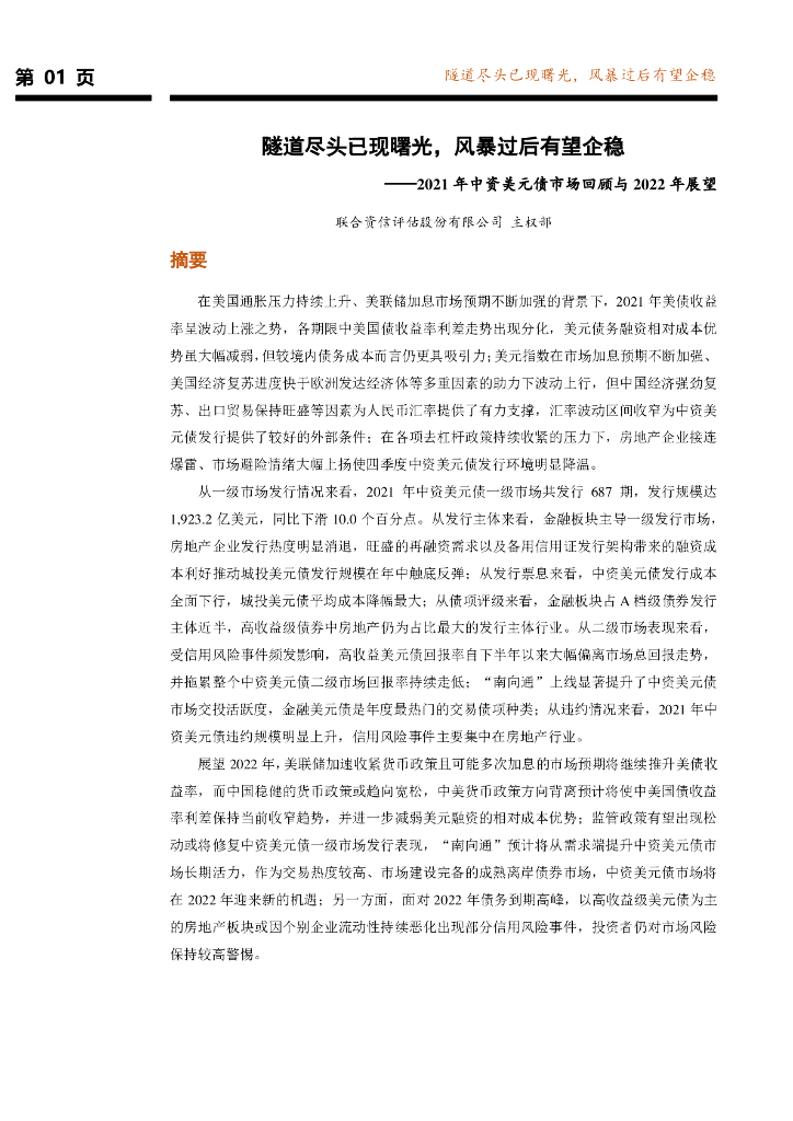 联合资信:隧道尽头已现曙光,风暴过后有望企稳-2021年中资美元债市场回顾与2022年展望.pdf
