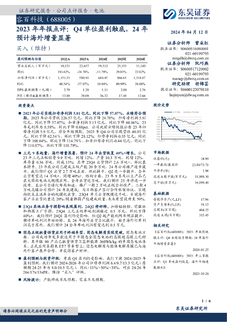 东吴证券:容百科技(688005)-2023年年报点评:Q4单位盈利触底,24年预计海外增量显著.pdf