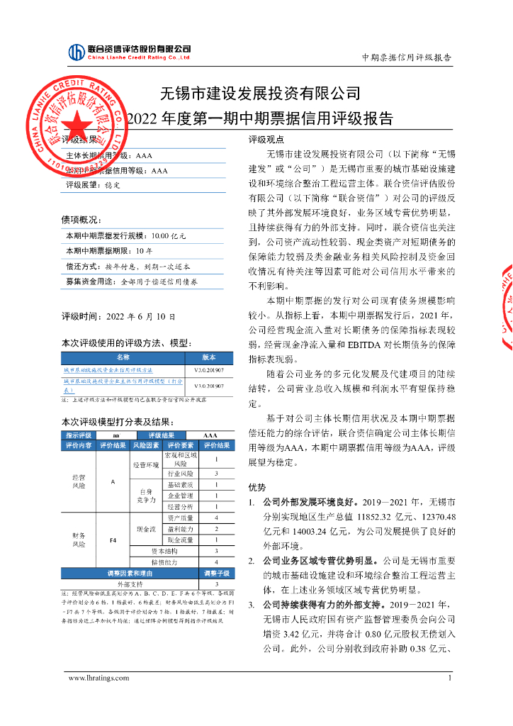 联合资信:无锡市建设发展投资有限公司2022年度第一期中期票据信用评级报告及跟踪评级安排.pdf