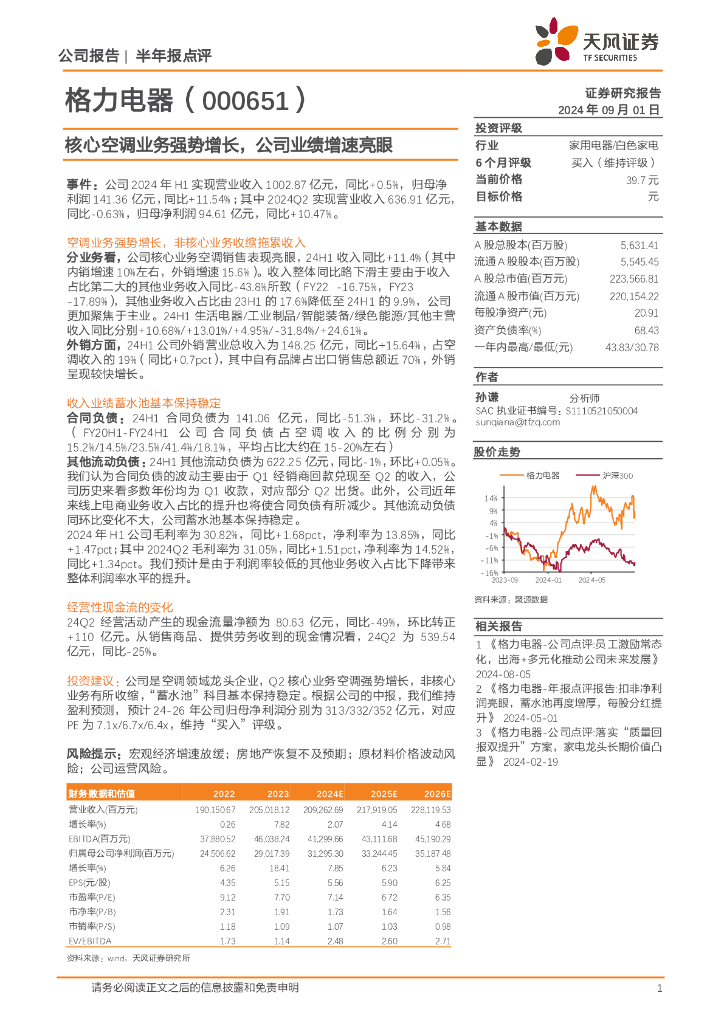 天风证券:格力电器(000651)-核心空调业务强势增长,公司业绩增速亮眼.pdf