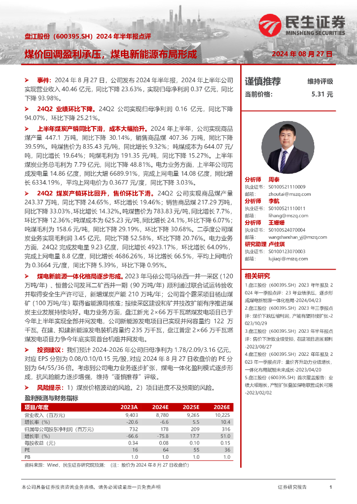 民生证券:盘江股份(600395)-2024年半年报点评:煤价回调盈利承压,煤电新能源布局形成.pdf