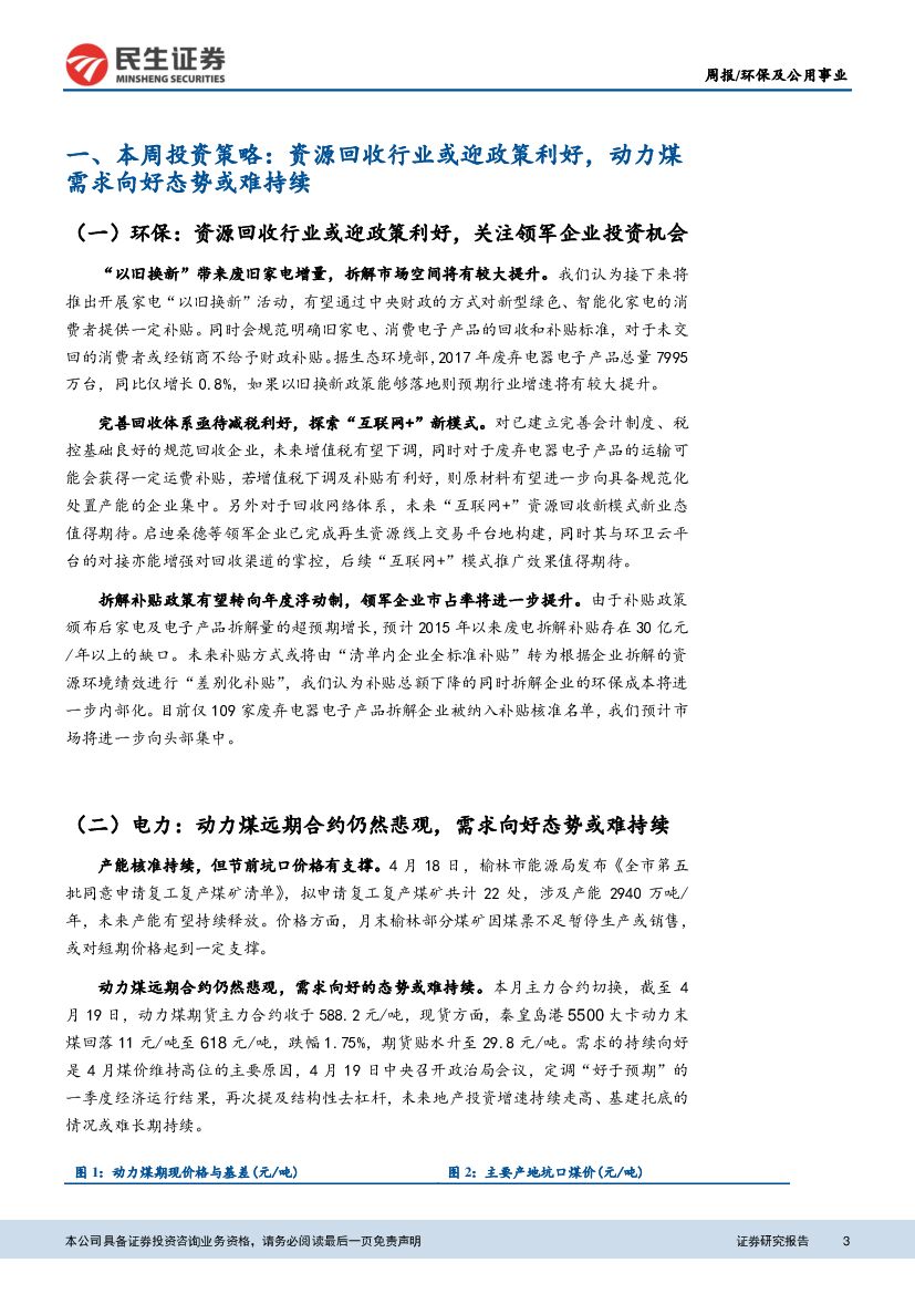 民生证券:环保及公用事业行业周报:资源回收行业或迎政策利好,动力煤需求向好态势或难持续.pdf