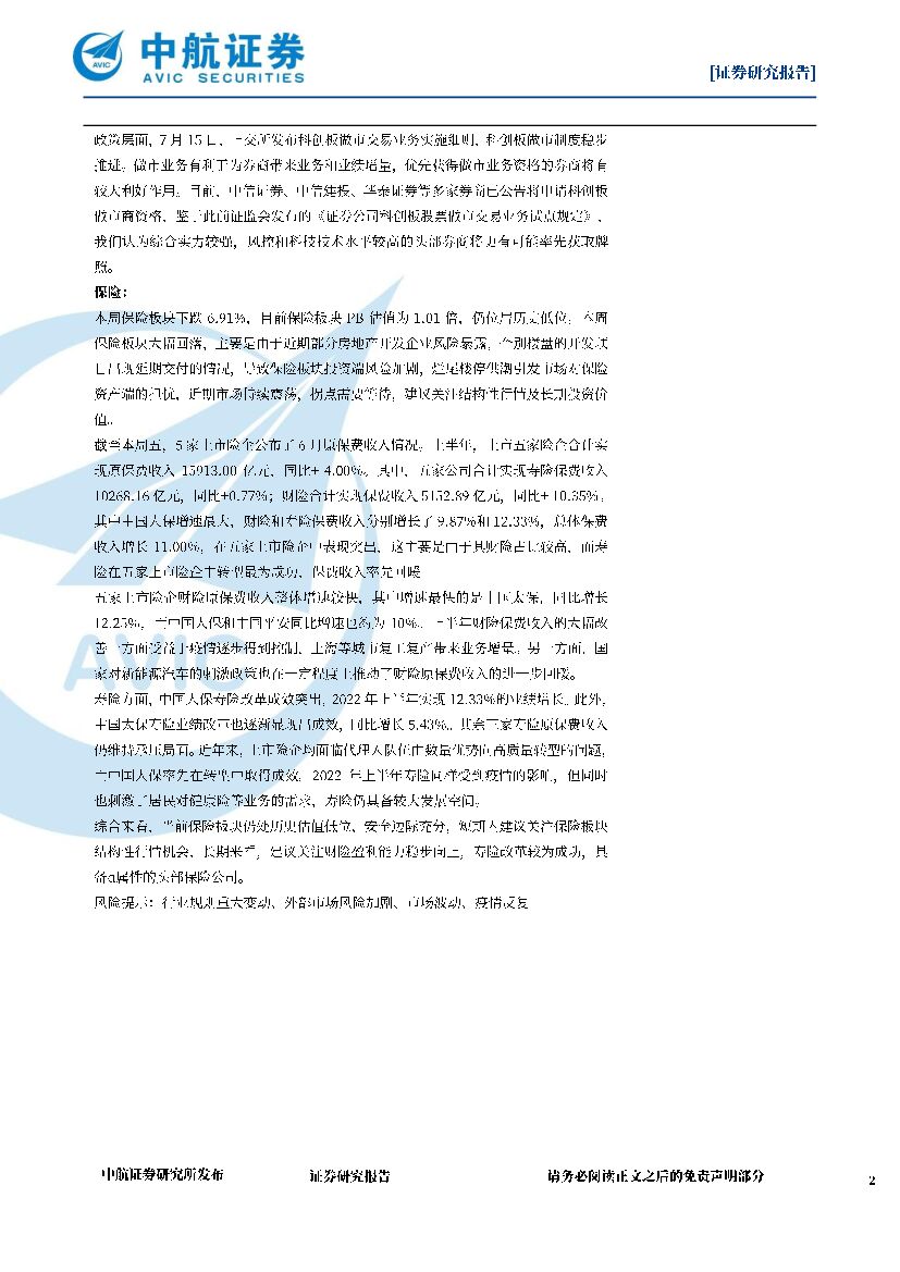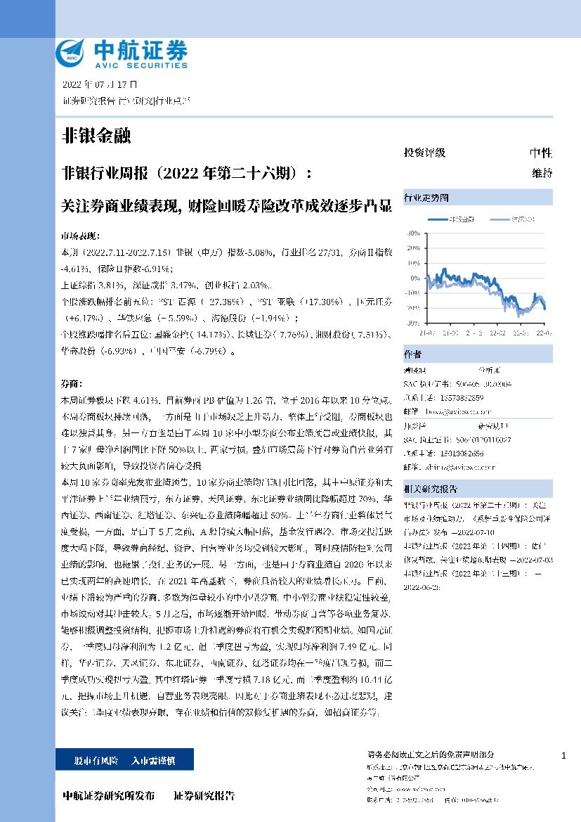 中航证券:非银行业周报(2022年第二十六期):关注券商业绩表现,财险回暖寿险改革成效逐步凸显.pdf