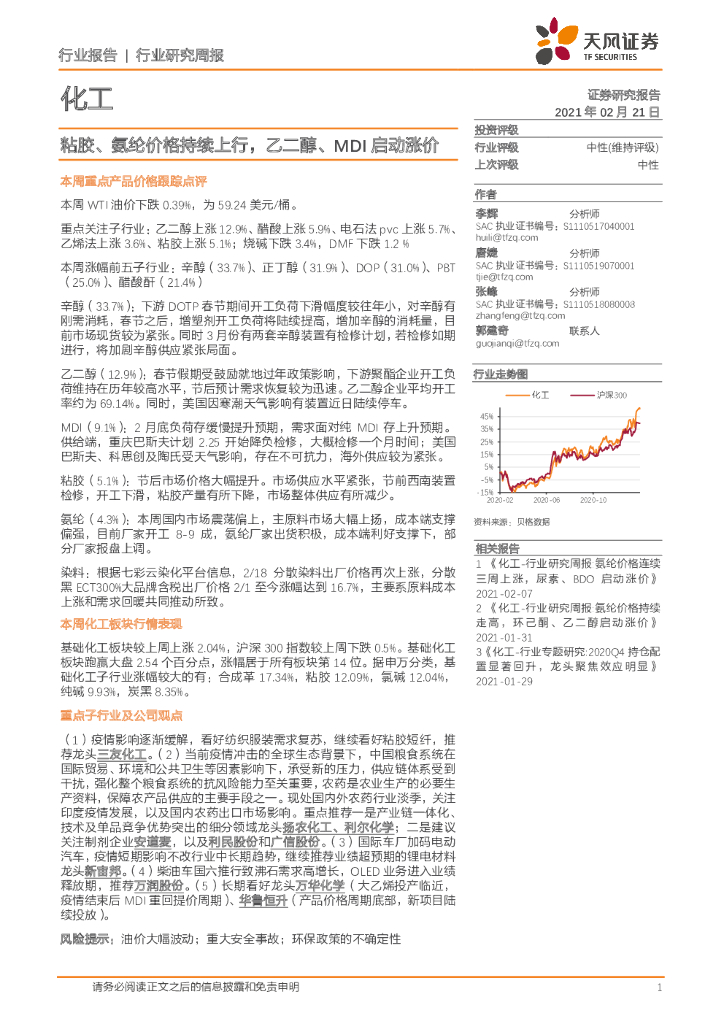 天风证券:化工行业:粘胶、氨纶价格持续上行,乙二醇、MDI启动涨价.pdf