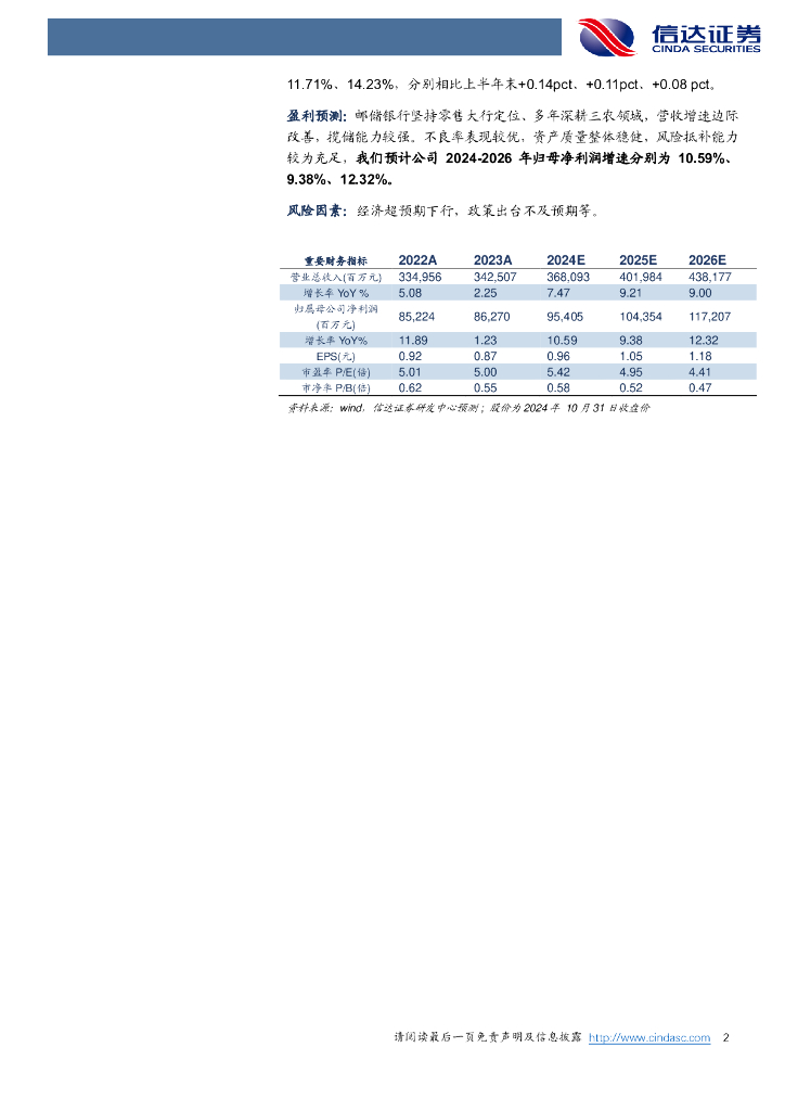 信达证券:邮储银行2024三季报点评:营收利润增速回正,代理费率调整贡献利润.pdf