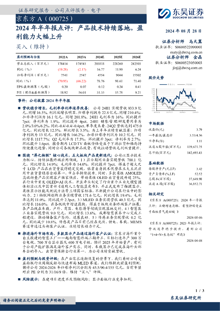 东吴证券:京东方A(000725)-2024年半年报点评:产品技术持续落地,盈利能力大幅上升.pdf