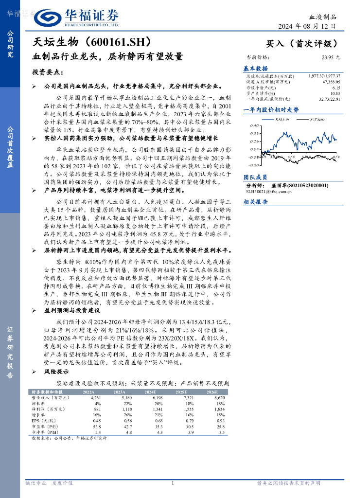 华福证券:天坛生物(600161)-血制品行业龙头,层析静丙有望放量.pdf