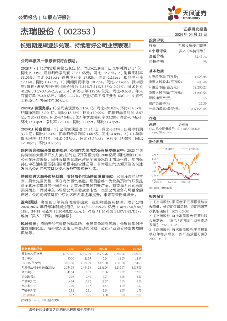天风证券:杰瑞股份(002353)-长短期逻辑逐步兑现,持续看好公司业绩表现!.pdf